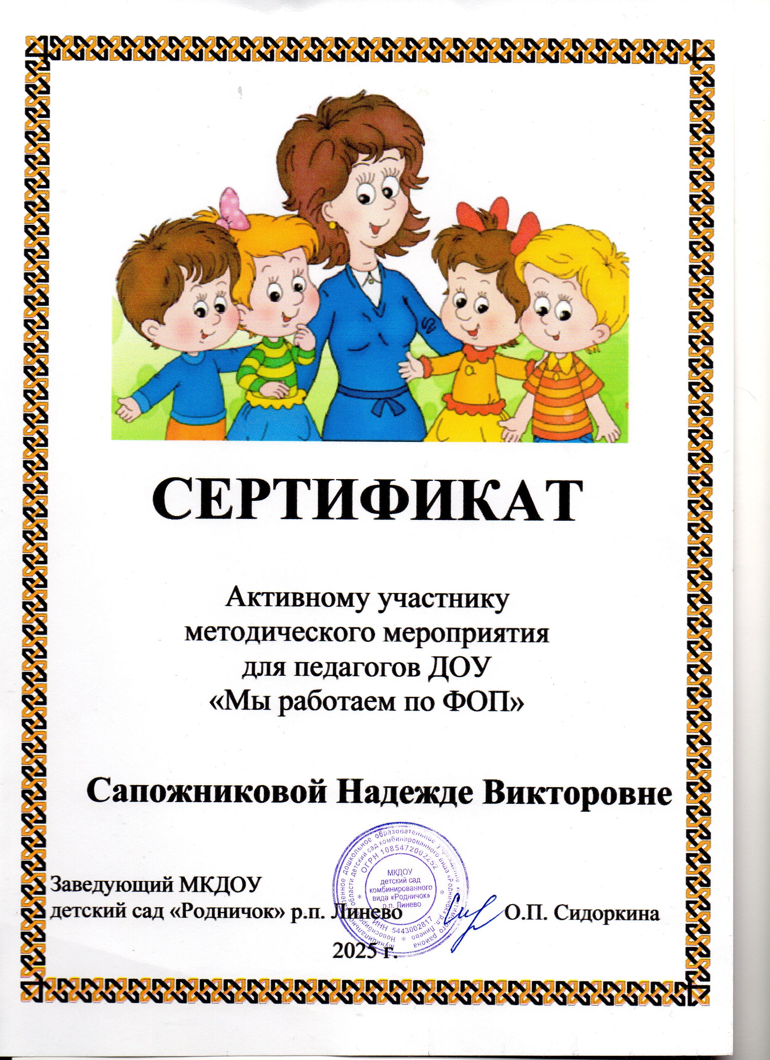 Сертификат активному участнику методического мероприятия для педагогов ДОУ "Мы работаем по ФОП" 2025г